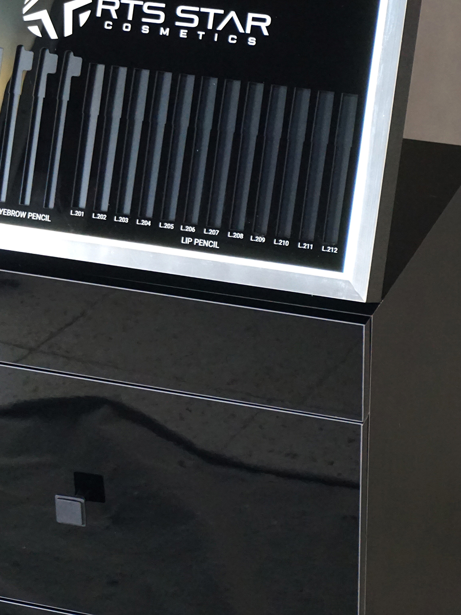بدنهی براق و مقاوم همراه با تابلو تبلیغاتی روشن در بخش فوقانی، جلوهای لوکس و متمایز به فضای فروشگاهی میبخشد. همچنین کشوهای تعبیهشده در بخش پایینی، فضای مناسبی برای نگهداری موجودی و اقلام پشتیبانی در اختیار فروشگاه قرار میدهد.