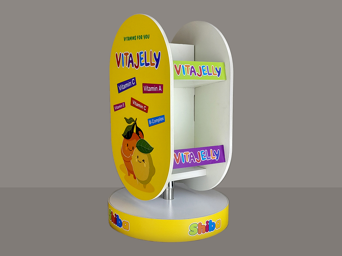 این استند جذاب و رنگارنگ برای برند Vitajelly طراحی شده و بهویژه برای نمایش محصولات ویتامینی این برند مناسب است. با طراحی منحصر به فرد، این استند توجه مشتریان را به خود جلب میکند و فضای شاد و پرانرژی را در فروشگاهها ایجاد میکند. استفاده از رنگهای زنده مانند زرد و رنگهای متنوع روی برچسبهای ویتامینها، به همراه شخصیتهای کارتونی میوهای، این استند را به یک عنصر جذاب و کودکانه تبدیل کرده که هم برای مشتریان بزرگسال و هم برای کودکان جذاب است. استند دو طرفه آن، فضایی مناسب برای نمایش منظم محصولات ویتامینی فراهم میآورد. طراحی کاربردی و فضای ذخیرهسازی بهینه، این استند را به یک انتخاب عالی برای فروشگاهها و داروخانهها تبدیل کرده