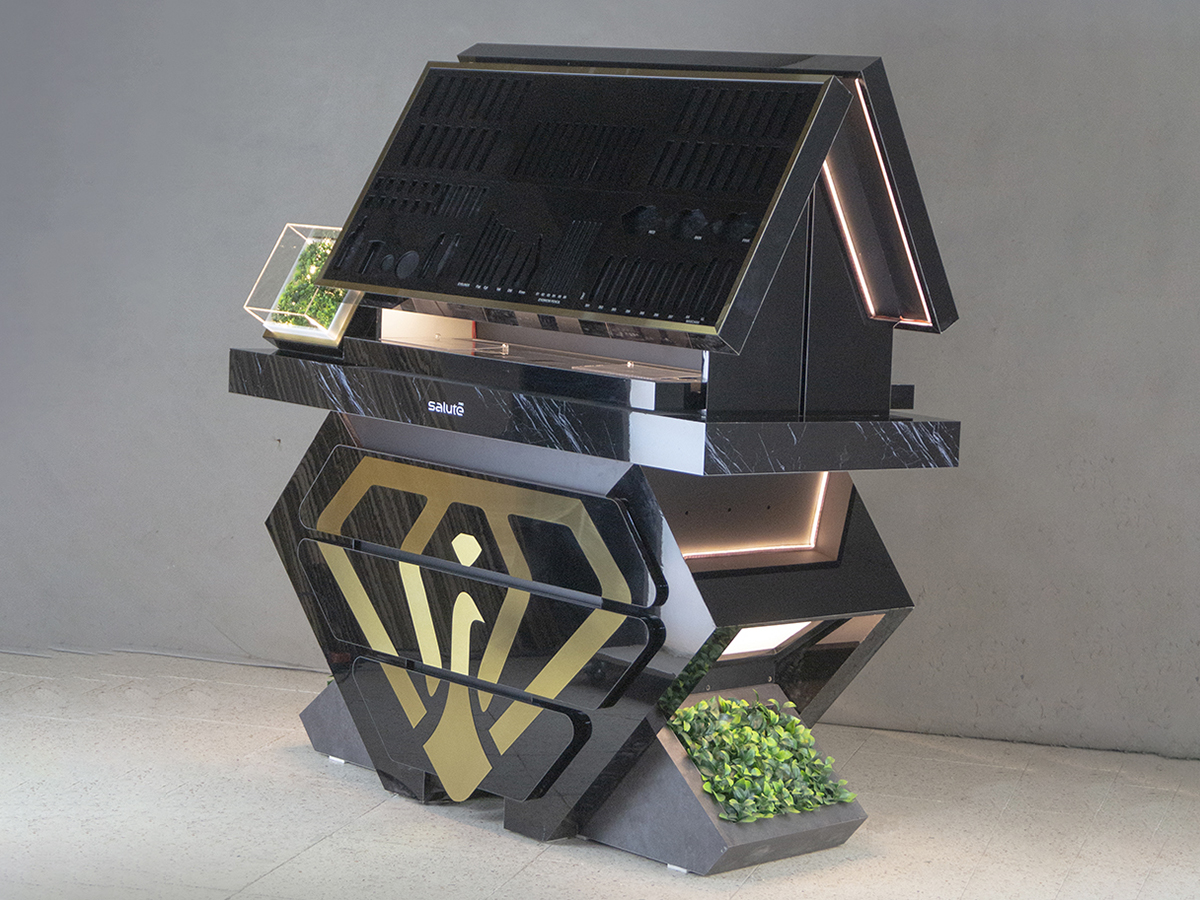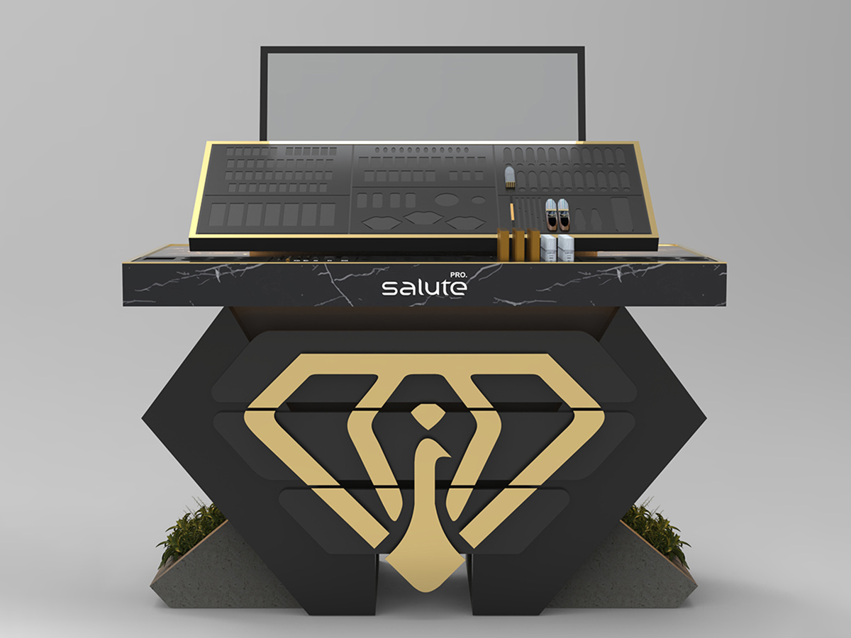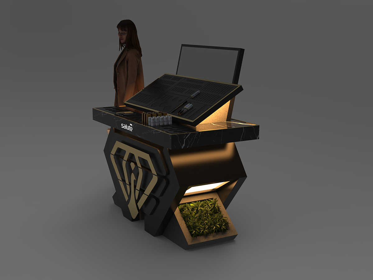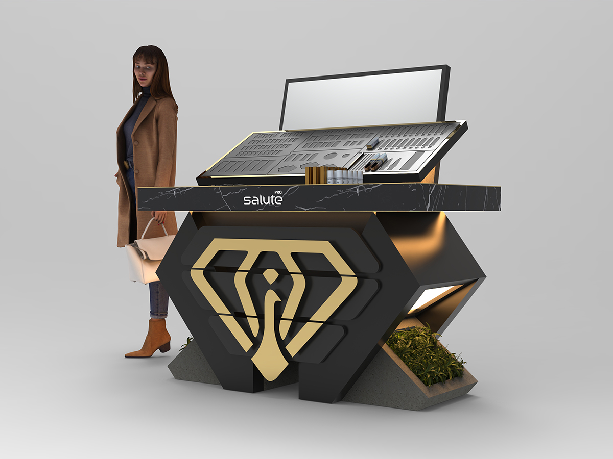 این استند با ترکیب متریال لوکس، فرمهای هندسی مدرن و نورپردازی دقیق، جلوهای چشمگیر برای نمایش حرفهای محصولات آرایشی فراهم میکند. چیدمان کاربردی، آینهی بزرگ و سطح کار مناسب، تجربهای راحت و جذاب برای مشتری ایجاد میکند.