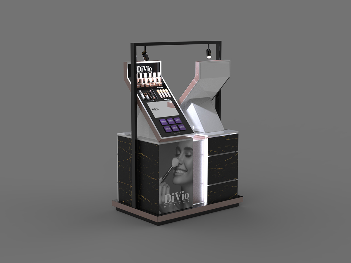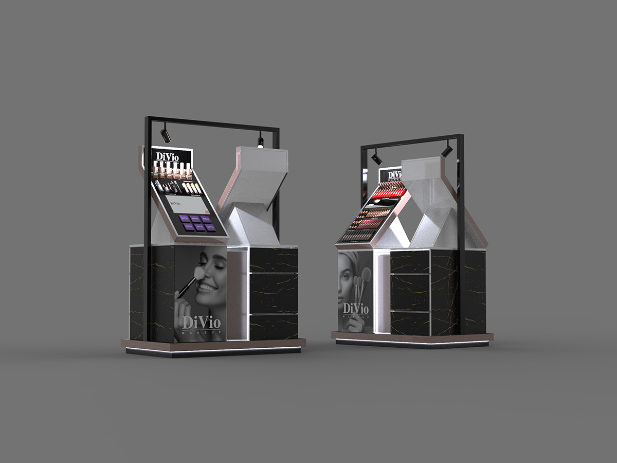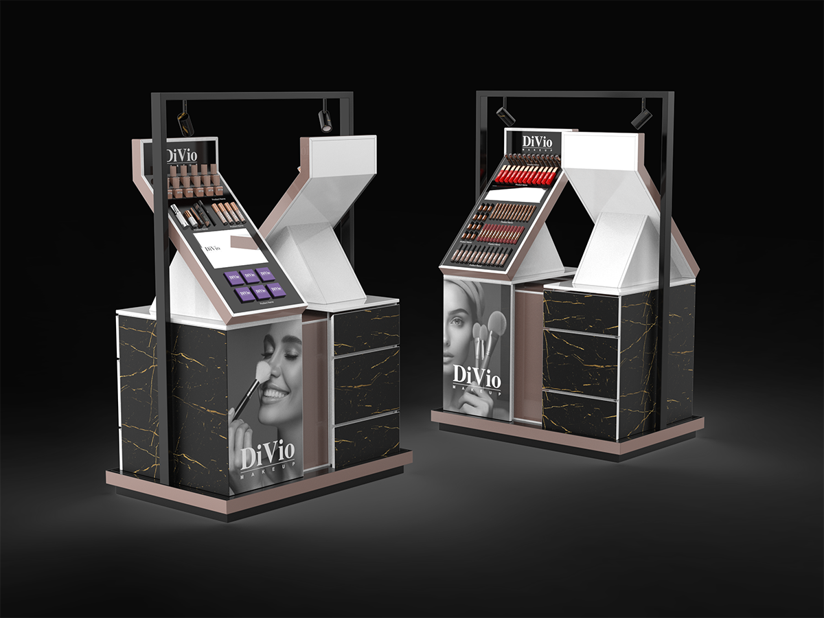 استند دوطرفه DiVio با طراحی منحصربهفرد و لوکس، تجربهای کاملاً متفاوت از نمایش محصولات آرایشی را ارائه میدهد. این استند با ساختار دوطرفهی نوآورانه، امکان ارائهی همزمان چند گروه محصول را در فضایی محدود فراهم کرده و جلوهای چشمگیر به فروشگاه میبخشد. ترکیب متریال مشکی مرمری با رگههای طلایی، در کنار نورپردازی اختصاصی و تصاویر تبلیغاتی برند، استندی مدرن و بیرقیب خلق کرده است که مشابه آن کمتر در بازار دیده میشود.