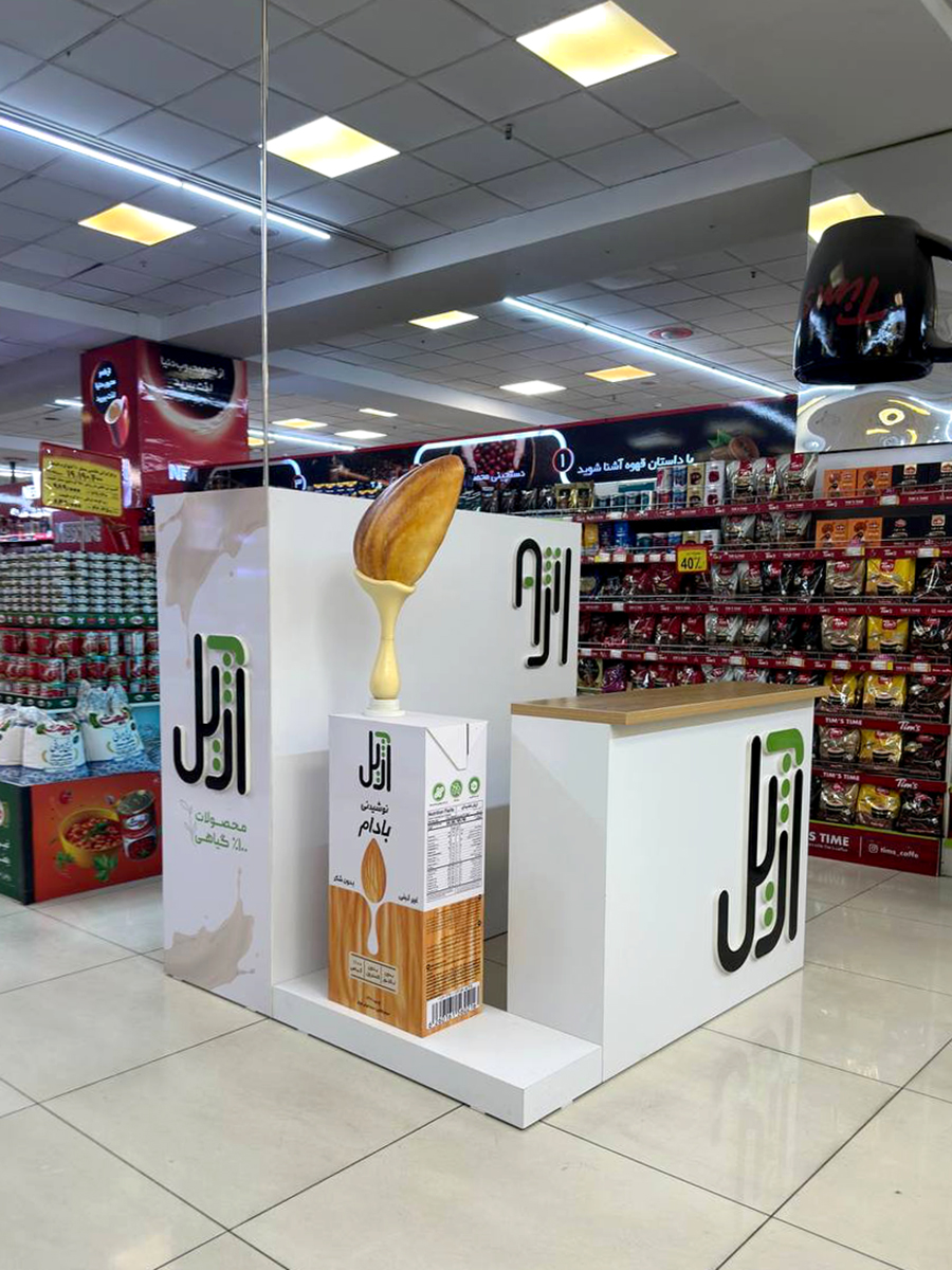 این استند معرفی محصولات برند آژیل با طراحی ساده و در عین حال مدرن، در محیط فروشگاهها به شکلی چشمگیر توجه مخاطب را جلب میکند. استفاده از رنگ سفید و لوگوی برجسته برند، هویت بصری آژیل را بهخوبی نمایان کرده و تصویر سهبعدی بادام همراه با جریان طبیعی نوشیدنی، حس تازگی و طبیعی بودن محصول را القا میکند. پیشخوان تعبیهشده در کنار استند نیز فضایی مناسب برای ارائه نمونه و تعامل مستقیم با مشتریان فراهم آورده است. این طراحی علاوه بر ایجاد جلوهای حرفهای و منسجم، تجربهای خوشایند از آشنایی با نوشیدنیهای گیاهی آژیل، بهویژه شیر بادام، را برای خریداران رقم میزند و جایگاه برند را به عنوان تولیدکننده محصولاتی سالم و طبیعی در ذهن مخاطب تثبیت میکند.