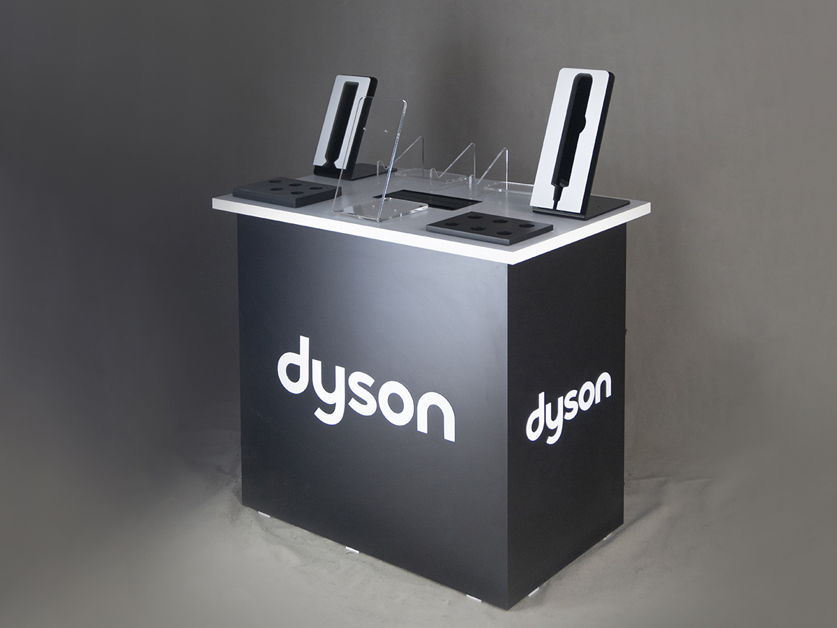 این کانتر با طراحی مینیمال و ساختار مستحکم، ویژهی معرفی محصولات آرایش موی دایسون طراحی شده است. ترکیب رنگ مشکی–سفید و لوگوی برجسته، هویت بصری برند را برجسته کرده و جلوهای لوکس ایجاد میکند. سطح کاربری بهصورت ارگونومیک طراحی شده تا امکان نمایش و تست مستقیم دستگاهها و اکسسوریها فراهم شود. استفاده از متریال باکیفیت و چینش منظم اجزا، این استند را به گزینهای ایدهآل برای فروشگاههای لوکس، نمایشگاهها و کمپینهای پروموشن تبدیل کرده است.