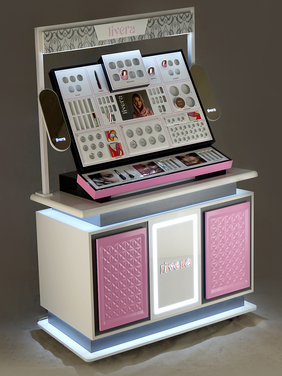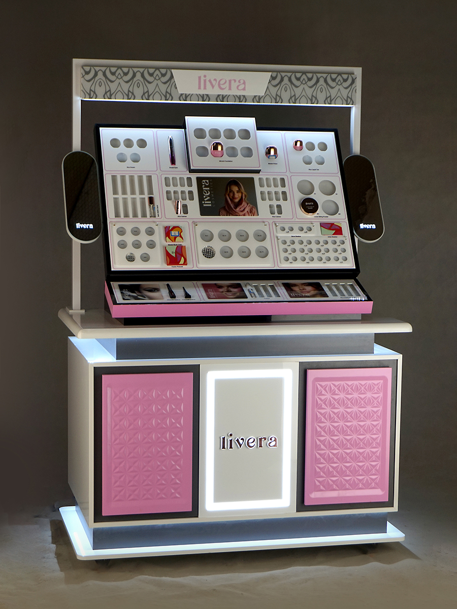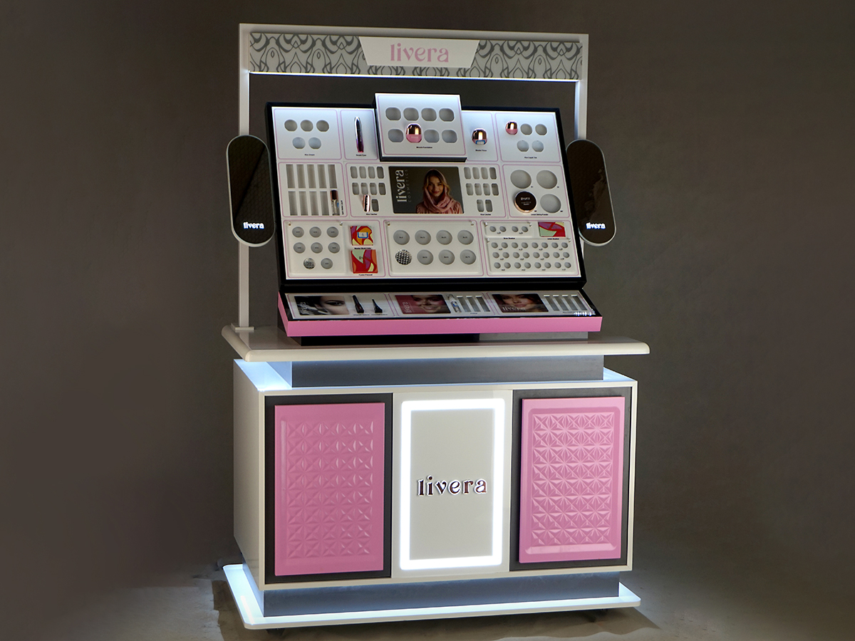 این گوندولا با هدف نمایش منسجم محصولات آرایشی برند Livera طراحی شده است. ترکیب رنگ سفید و صورتی در کنار نورپردازی نرم، فضایی هماهنگ با هویت زنانه و ظریف برند ایجاد کرده است. ماژولهای متنوع برای چیدمان گروههای مختلف محصول، همراه با آینههای جانبی، تجربهای کامل و کاربردی برای معرفی و تست محصولات فراهم میکند. طراحی تمیز و اجرای دقیق جزئیات، این سازه را به یکی از نمونههای شاخص در دستهی استندهای آرایشی تبدیل کرده است.
