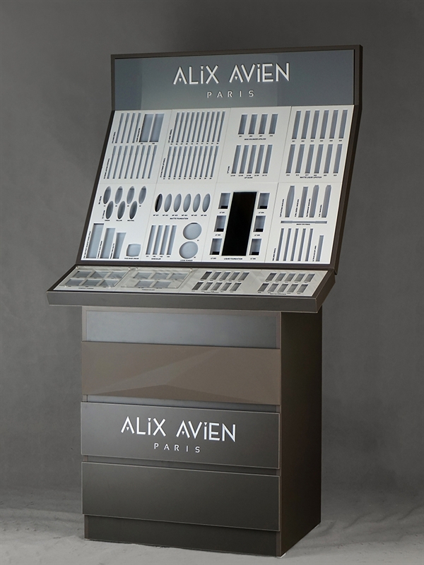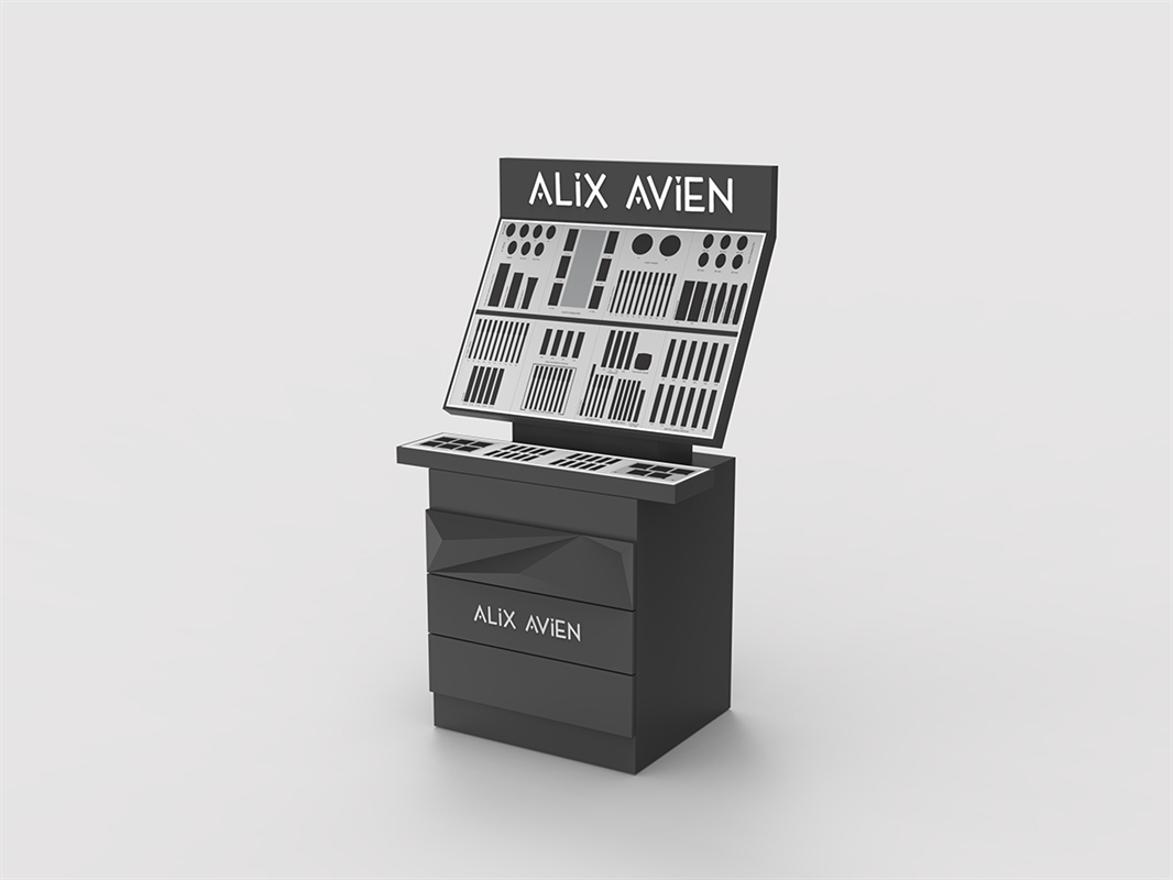 The ALIX AVIEN cosmetic floor stand, with its modern design and highly professional structure, is a distinguished choice for stores. The combination of matte black with the brand’s white logo creates a stylish and striking presence that harmonizes seamlessly with various décors.