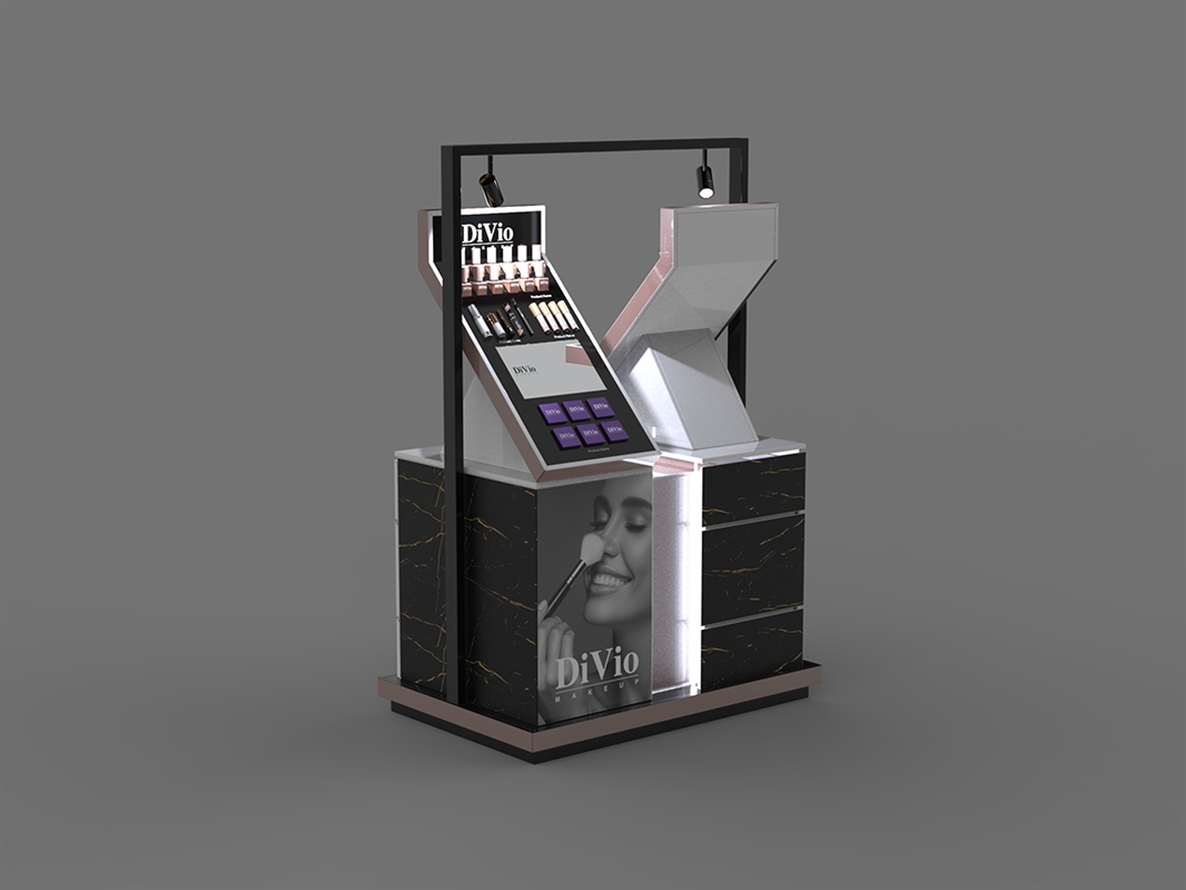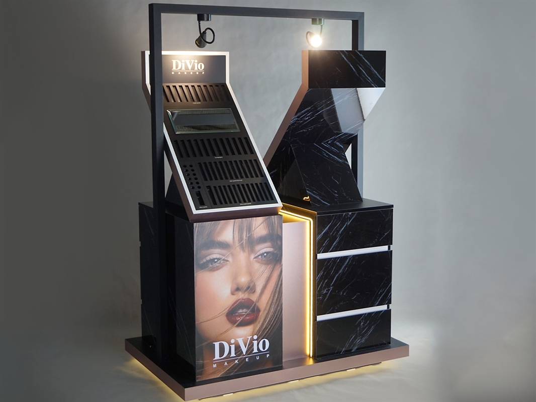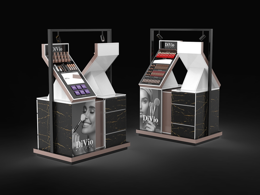 The double-sided DiVio stand, with its unique and luxurious design, offers a completely different experience for displaying cosmetic products. Its innovative double-sided structure allows multiple product groups to be showcased simultaneously within a limited space, creating a striking presence in the store.