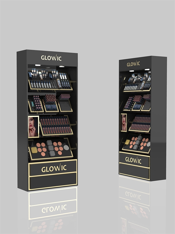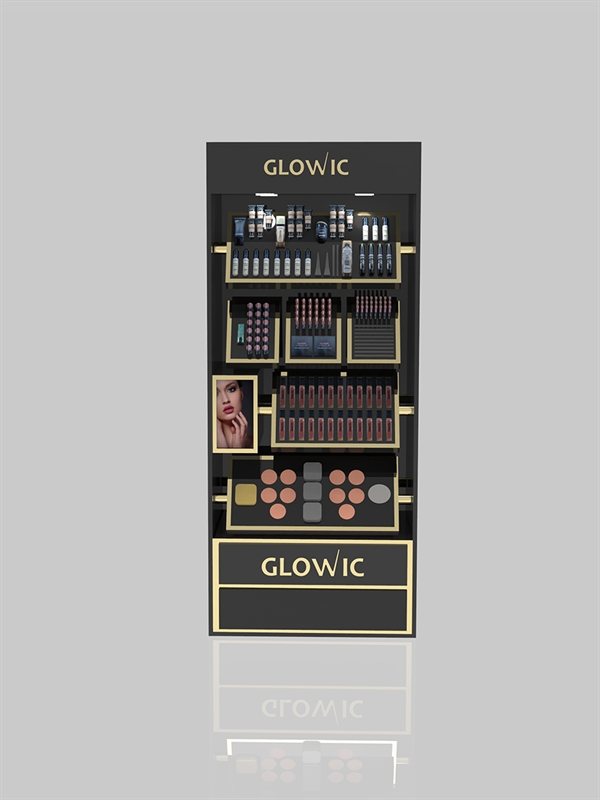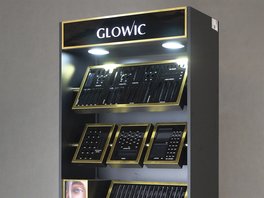 This freestanding stand, with a modern design and modular structure, is specifically created for professional display of Glowic cosmetic products. The black body with gold accents creates a luxurious and harmonious appearance.