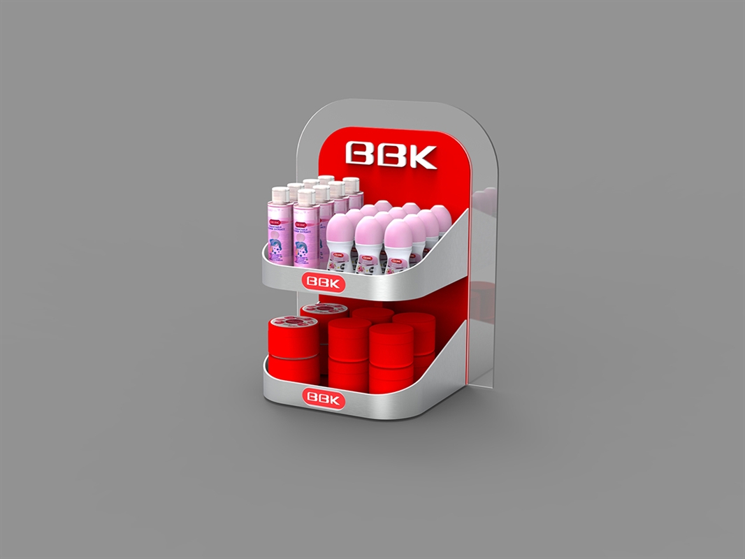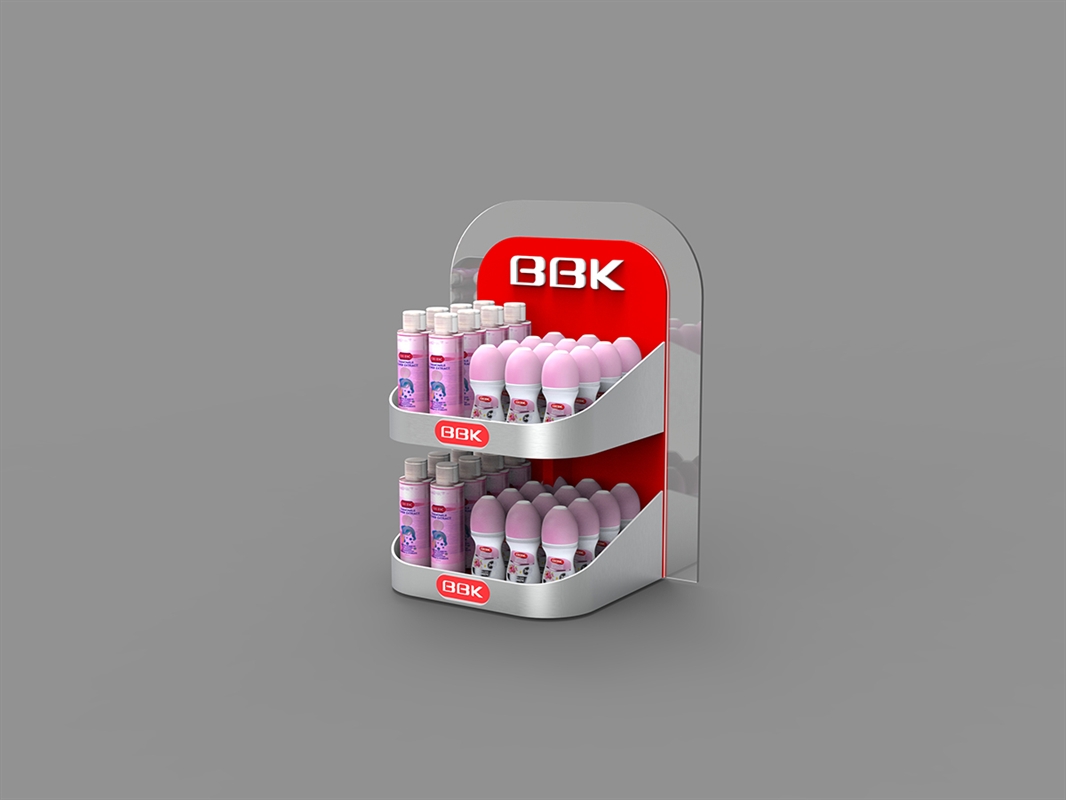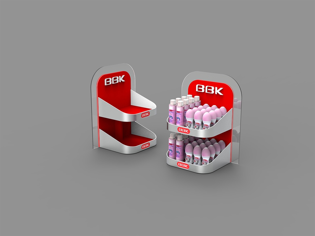 The compact and eye-catching design of this stand displays products such as roll-ons and lotions in an organized and accessible manner. With a height suitable for placement on a countertop, this stand is an ideal choice for attracting attention in small retail spaces. Its sturdy body, brand-focused color scheme, and modern form make the shopping experience more appealing and professional.
