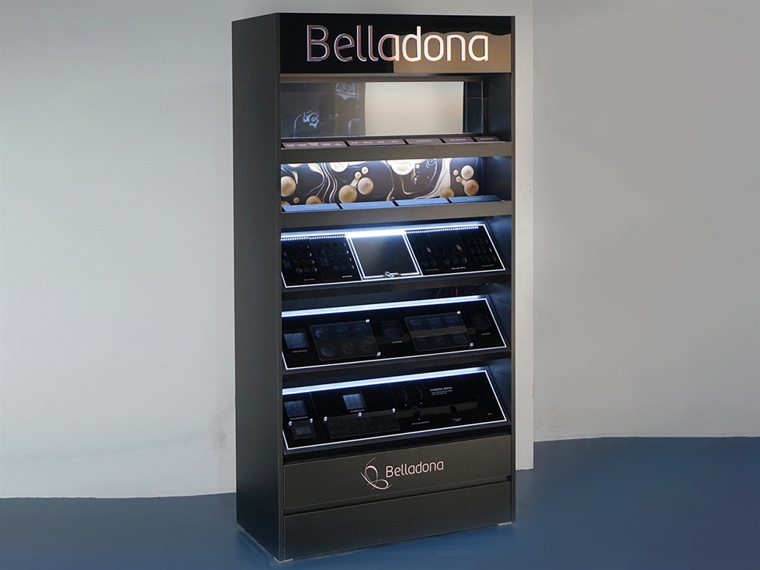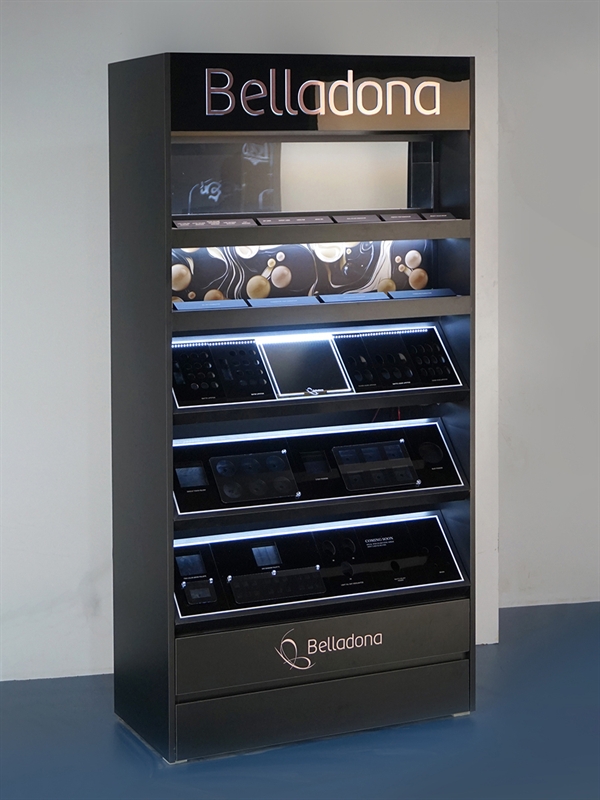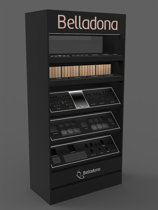 A minimal, luxurious, and fully functional design for displaying a wide variety of cosmetic products. This stand, with its combination of black color and subtle lighting, gives the store space a stylish and professional look. Its precise sectioning allows for organized and separate presentation of various products, including palettes, powders, lipsticks, eyeshadows, and testers.